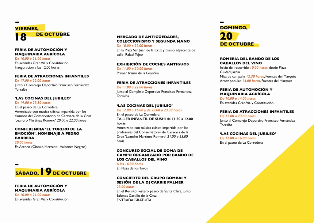 Exposición y venta de vehículos y maquinaria agrícola de la mano de más de 20 empresas y lo mejor de la gastronomía y de la artesanía de la tierra se darán cita en la Feria de Caravaca, que se celebra los días 18, 19 y 20 de octubre, arropada por un completo y variado programa de actividades.
