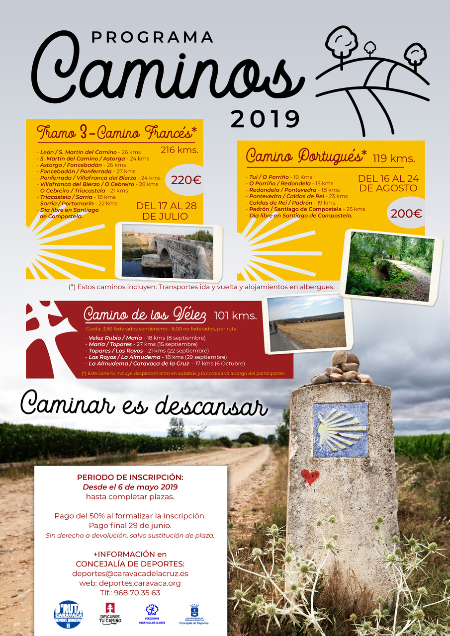 La Concejalía de Deportes del Ayuntamiento de Caravaca de la Cruz mantiene abierto el plazo de inscripción en la edición de 2019 del programa ‘Caminos’, con el lema ‘Caminar es descansar’ con dos peregrinaciones, de distinto recorrido, por el Camino de Santiago y cinco salidas por las etapas del ‘Camino de los Vélez’.