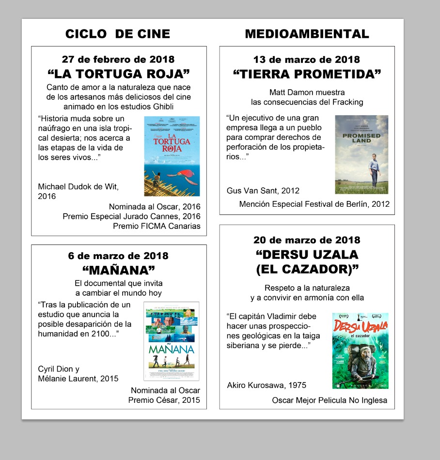 El ciclo dará comienzo el martes 27 de febrero, con ‘La tortuga roja’, película de Michael Dudok de Wit, nominada a los Óscar y galardonada con el premio especial del jurado de Cannes y el premio Festival Internacional de Cine del Medio Ambiente (FICMA) en 2016. La siguiente proyección será el martes 6 de marzo con ‘Mañana’, un documental que invita a cambiar el mundo, también nominado a los Óscar y premio César 2015.