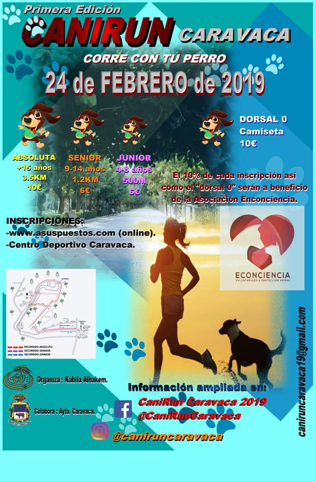 El 24 de febrero tendrá lugar la primera edición del "CaniRun Caravaca", una prueba deportiva en la que se puede participar con las mascotas. Es una iniciativa de la Asociación Cultural "Kabila Alhakem", en colaboración con la Concejalía de Deportes del Consistorio caravaqueño.