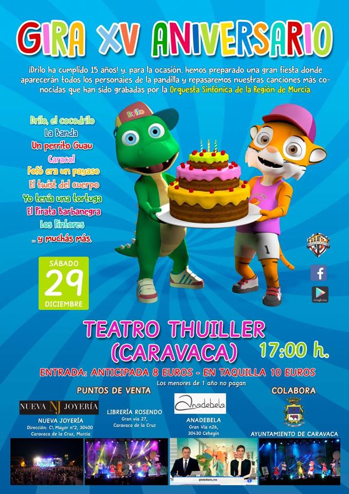 El sábado, 29 de diciembre, ‘Drilo, cocodrilo’ llega al teatro Thuillier de Caravaca de la Cruz, dentro de la gira de su XV aniversario. El espectáculo, promovido por la peña caballista Universo, con la colaboración del Ayuntamiento de Caravaca, dará comienzo a las 17.00 horas, con una entrada de ocho euros anticipada y diez en taquilla. Los puntos de venta están situados en Nueva Joyería, Librería Rosendo y Anadebella (Cehegín).