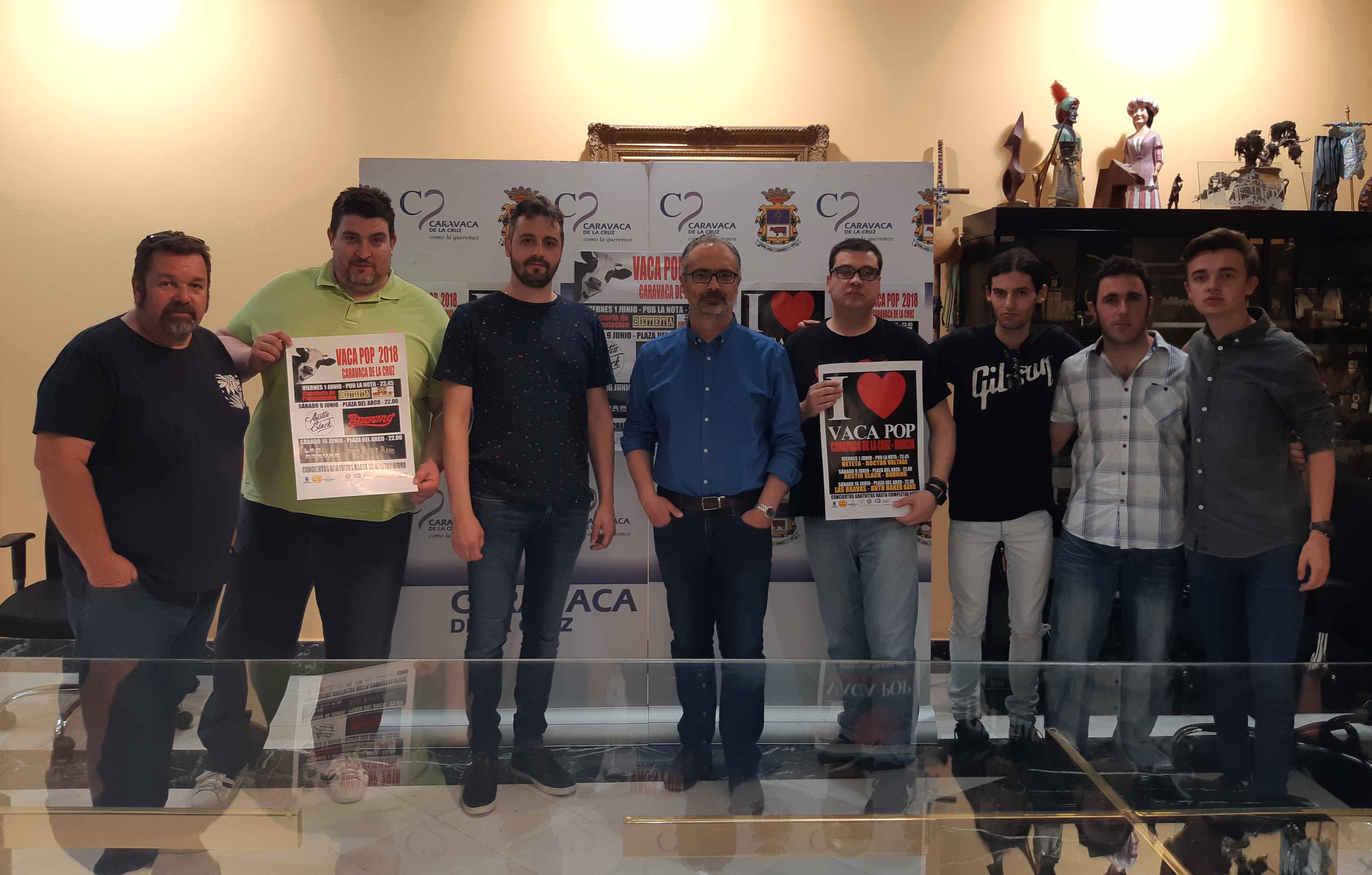 28/05/18. La edición 2018 del festival caravaqueño ‘Vaca Pop’ se celebra del 1 al 16 de junio con tres conciertos de acceso gratuito, que fueron presentados por el alcalde de Caravaca del la Cruz, José Moreno, y el concejal de Cultura en el Ayuntamiento de Caravaca de la Cruz, Óscar Martínez, junto a los componentes de la asociación ‘Vaca Pop’, Bryn Slack, Mateo Marti y Antonio Fructuoso.