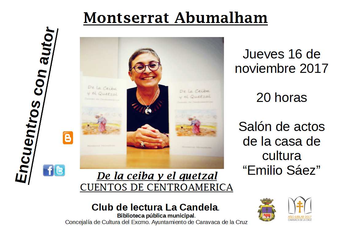 La Concejalía de Cultura del Ayuntamiento de Caravaca de la Cruz, a través de la Biblioteca Municipal y en colaboración con el Club de Lectura ‘La Candela’, continúa este jueves, 16 de noviembre, a las 20.00 horas, con los ‘Encuentros con autor’. En esta ocasión, estará protagonizado por la escritora Montserrat Abumalham, que presentará su libro de cuentos ‘De la Ceiba y el Quetzal’, en el salón de actos de la Casa de la Cultura ‘Emilio Sáez’.