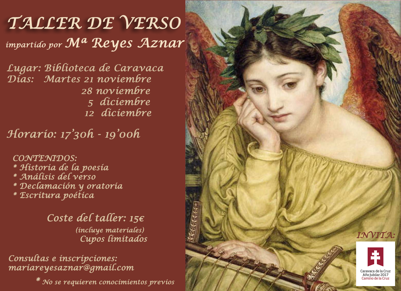 El Taller de Verso se desarrollará los martes 21 y 28 de noviembre y 5 y 12 de diciembre, de 17.30h a 19.00 horas. El importe de la matrícula es de 15 euros, incluyendo todos los materiales. Las reservas de plaza se pueden realizar a través al correo Esta dirección de correo electrónico está siendo protegida contra los robots de spam. Necesita tener JavaScript habilitado para poder verlo. o del teléfono +34611085953.